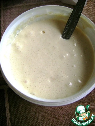 • Вот так спустя сутки. В готовую закваску добавить соду и активно перемешать до вспенивания. Влить яйца, взбитые с солью до пены, и, постепенно, порциями, добавлять муку до получения теста гуще, чем на обычные блинчики, но жиже оладьевого. Добавить растительное масло и перемешать.