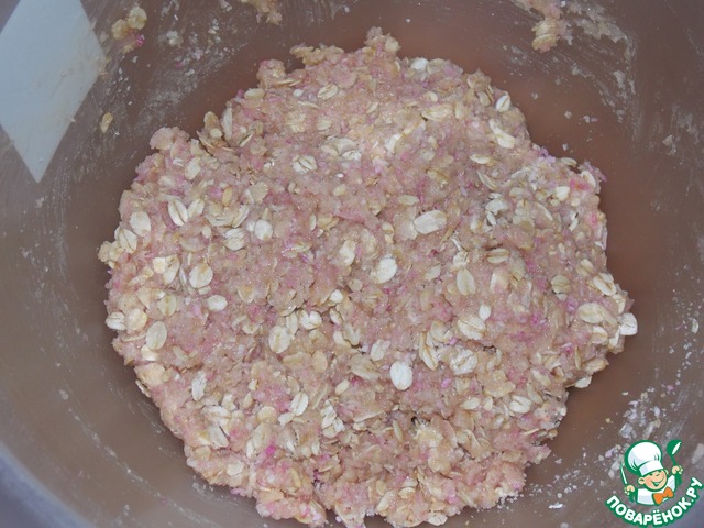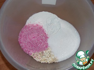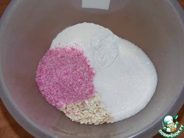 Смешать овсяные хлопья, муку, кокосовую стружку и сахар.