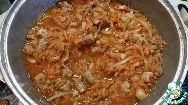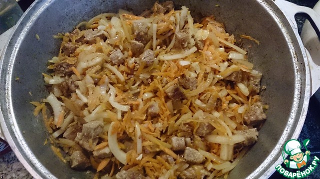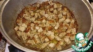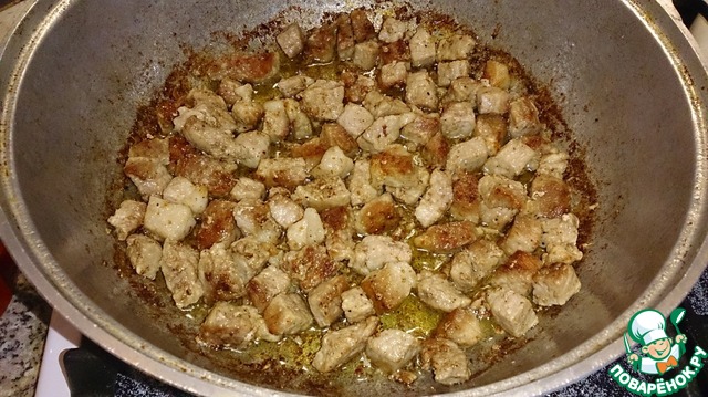 Мясо нарезать маленькими кубиками, обжарить на сильном огне до румяного цвета, я его немного присолила на этом этапе.