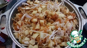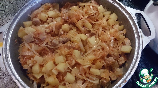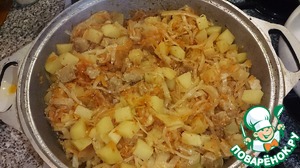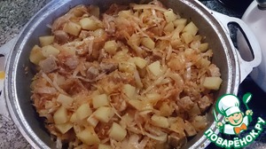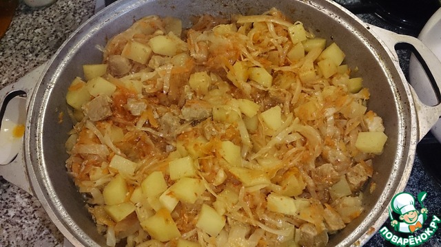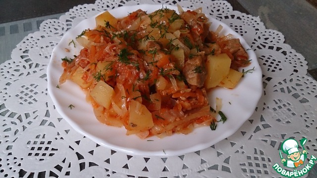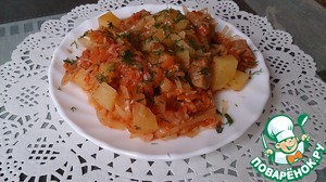 Все новое - хорошо забытое старое... а в моем случае разведанное. Отмечу отдельно, что в рецепте идет закладка картошки и капусты уже после томата. Это не ошибка, рецепт именно такой, благодаря этому картошка не разваривается. Как то в моей семье не принято было есть тушеную капусту, не знаю почему, а выйдя замуж, оказалось, что это одно из любимых блюд мужа, вот я и искала компромиссный вариант, чтоб и дети поели и мужу угодить. В общем ужин у нас получился что надо, может и вам пригодится!