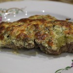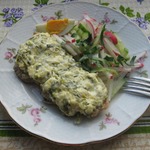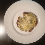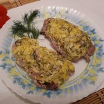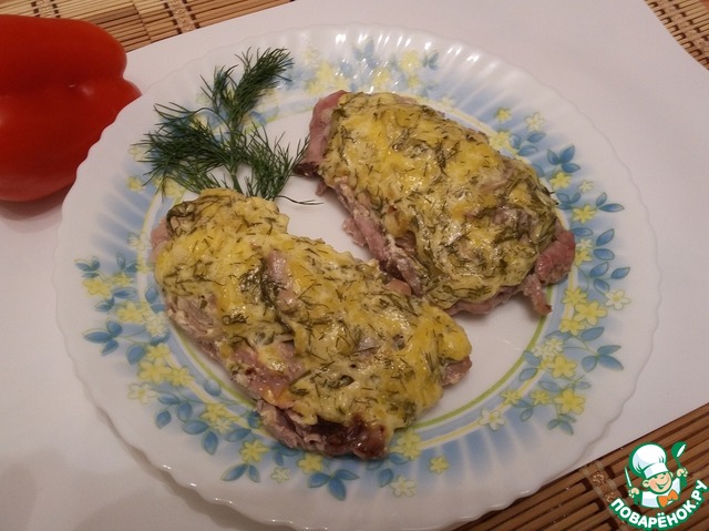 Сырно-сметанную смесь выкладываем на мясо. Такие вот лапти получились.