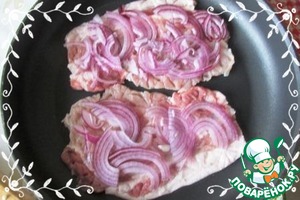 Мясо укладываем на сковороду или в форму. На мясо выкладываем лук.