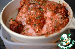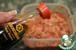 Соединить с фаршем, специями, добавить 1 ст. л. соевого соуса Kikkomаn и дать постоять 10 минут.