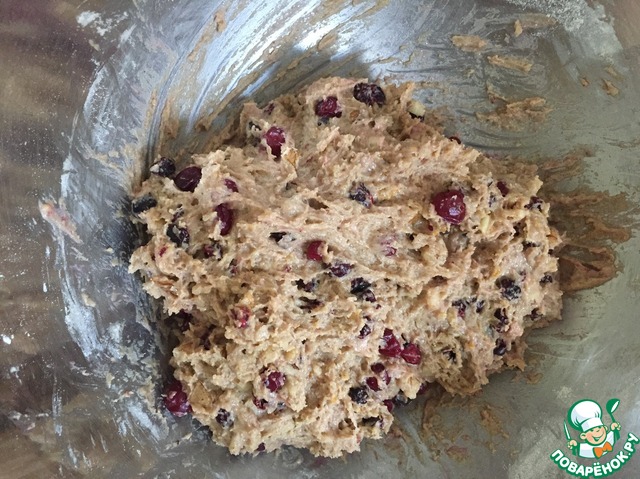 Соединить все ингредиенты и вымесить тесто. Добавить слегка подмороженную клюкву, вяленую клюкву вместе с апельсиновым фрешем и грецкие орехи. Все слегка перемешать. На этом этапе я убираю миксер и все делаю руками. Мешать нужно осторожно, чтобы клюква не полопалась и не отдала весь сок. -