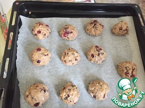 Формируем из полученной массы шарики диаметром 4-5 см (я это также делаю руками) и выкладываем на противень, застеленный пергаментом, на расстоянии примерно 3-4 см друг от друга (т. к. во время выпекания они "вырастут"). Получается 20-22 шарика.