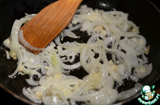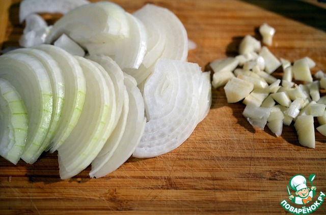 Лук (1 шт.) нарезать полукольцами, чеснок (1 зуб.) порубить.