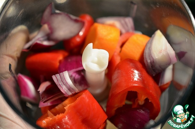 В чашу блендера положить морковь, лук, чеснок, перец.