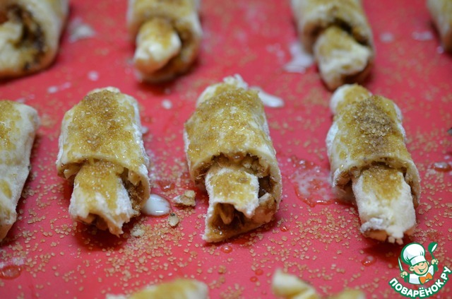 Выложить на противень, смазать желтком и посыпать коричневым сахаром. Выпекать при 180 С 25 мин.