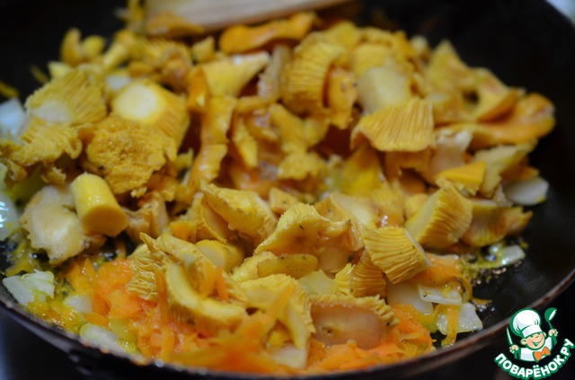 Репчатый лук, морковь и лисички обжарить на сливочном масле