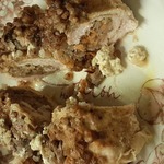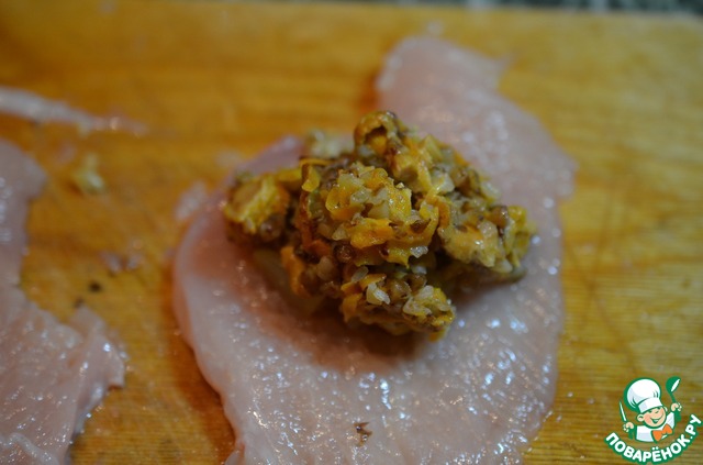 На отбитую курицу выложить по 2-3 ст. л гречи с грибами, завернуть плотным рулетом.