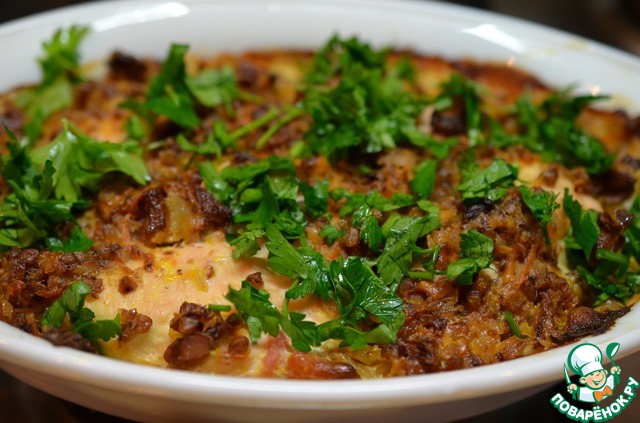 Залить остатками начинки и поставить в разогретую до 150 градусов духовку на 35 минут. По готовности включить гриль и подрумянить блюдо до легкой корочки.
