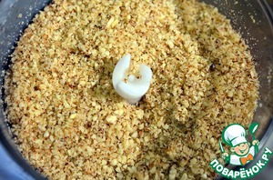 Перемолоть 1 стакан орехов вместе с 1/4 стакана сахарной пудры и щепоткой соли.