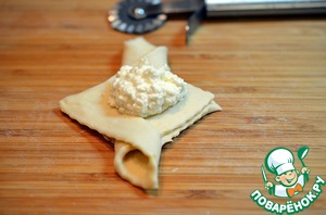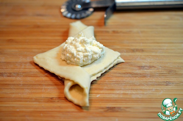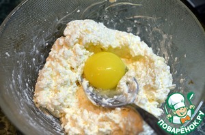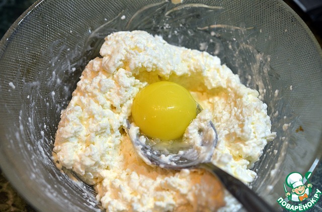 Приготовить начинку. В чашке смешать творог, желток, ванилин, цедру и сахарную пудру.