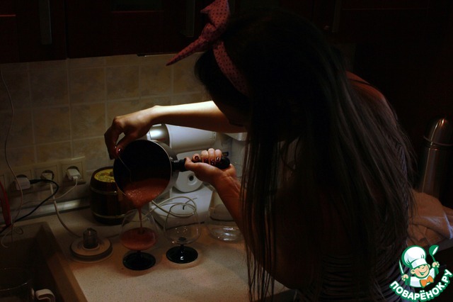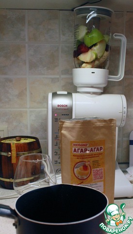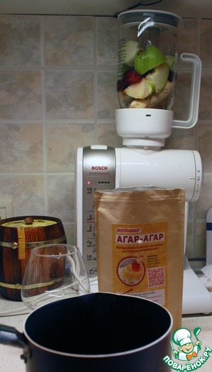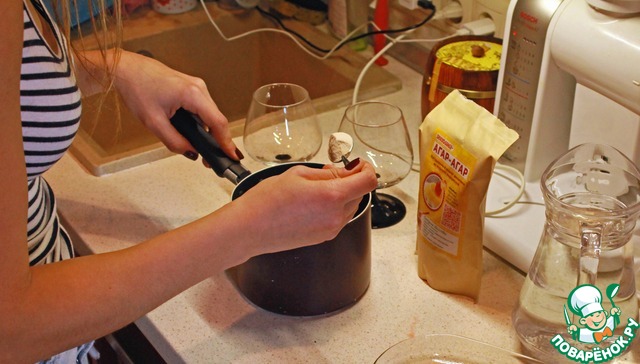 • В кастрюльку наливаем водички полстакана и кладем туда агар-агар, размешиваем. Половину пюре из блэндера смешиваем с агар-агаром и ставим на огонь. Доводим до кипения и снимаем.