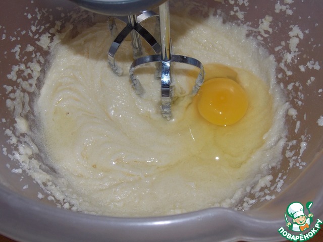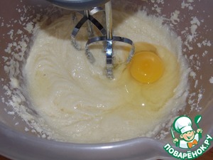 Не переставая взбивать, добавить по одному яйца, каждый раз тщательно перемешивая.