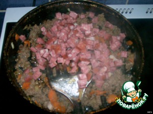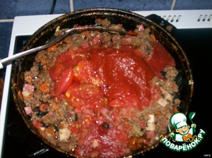 Лук мелко нарезать, морковь - прозрачными полукружьями. Спассеровать овощи на минимальном количестве растительного масла. Добавить к овощам фарш и мелко нарезанные грибы, обжарить до исчезновения в фарше красного сока. Копченые мясопродукты нарезать мелкими кубиками и добавить к фаршу, туда же выложить очищенные от кожицы и размятые консервированные помидоры вместе с заливкой, томатную пасту, все разбавить до необходимой густоты вином, посолить, поперчить, добавить чуть-чуть (примерно 1 ч. ложечку) сахара, орегано. Тушить при слабом кипении 10 - 15 мин.