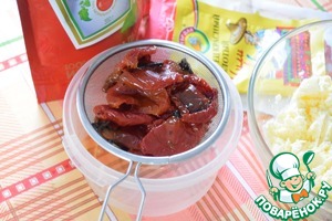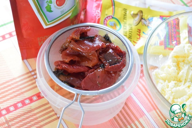 • Вяленые томаты выложить на ситечко и дать стечь растительному маслу (у меня ушло минут 30).