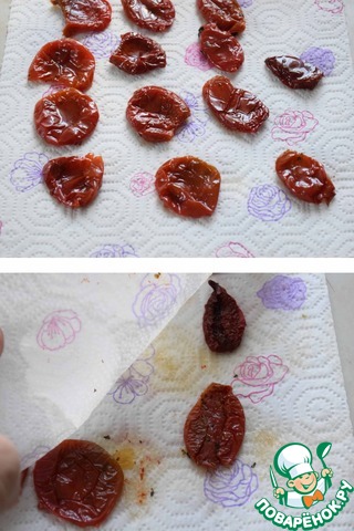 • Затем вяленые томаты выложить на бумажное полотенце, сверху закрыть еще одним и хорошо "промокнуть" остатки масла.