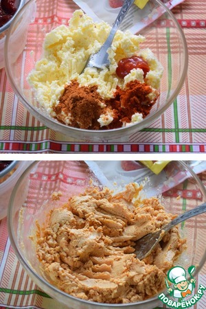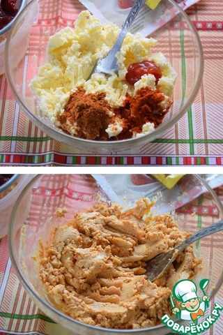 • В размятое масло добавить кетчуп, паприку, соль и перец-чили.