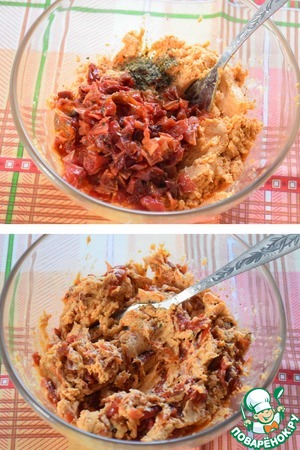 Вяленые томаты мелко порезать, добавить к маслу со специями, добавить базилик и еще раз хорошо размять вилкой.