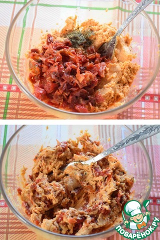 • Вяленые томаты мелко порезать, добавить к маслу со специями, добавить базилик и еще раз хорошо размять вилкой.