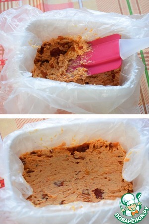 Выстелить пленкой квадратную пластиковую формочку или баночки, выложить наше ароматное масло и хорошо разровнять лопаточкой.