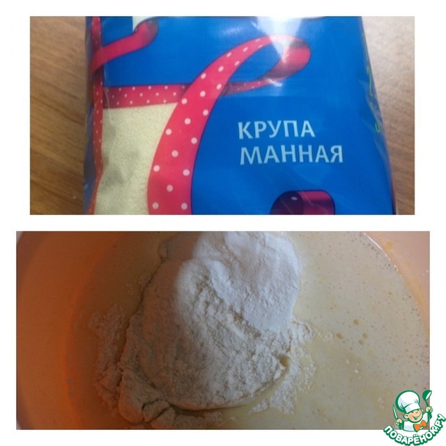 Яйца взбить с сахаром и ванилином в пышную пену. Добавить манку и молоко, перемешать.