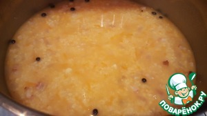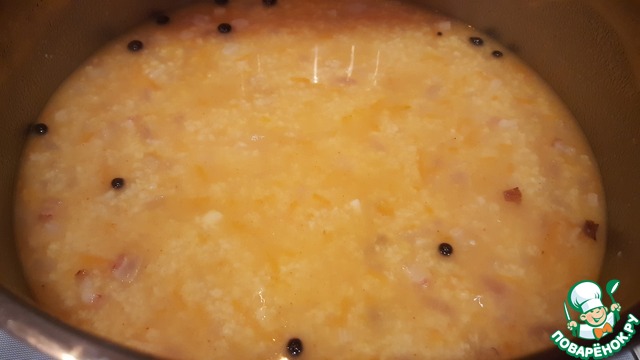 Довести до кипения. Привернуть немного огонь. При необходимости снять пену от гороха. Добавить промытое пшено. Помешивая довести до кипения, добавить душистый перец горошком и копчёную паприку.