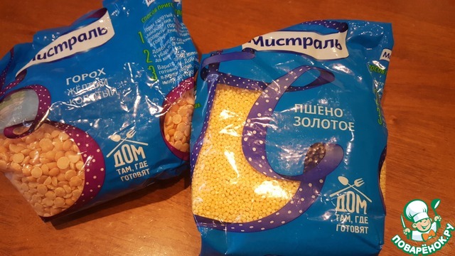 Пшено золотое ТМ Мистраль не требует предварительного замачивания и не горчит. Колотый горох тоже не требует предварительного замачивания и прекрасно разваривается за 30 минут.