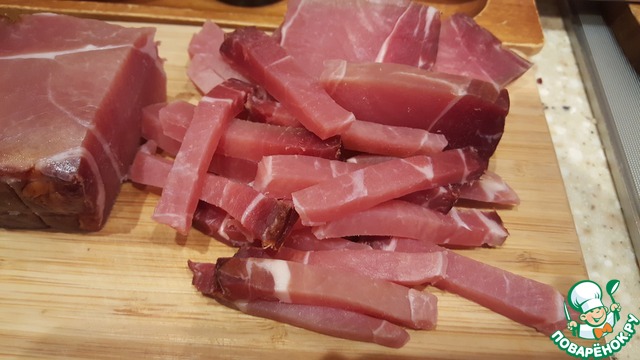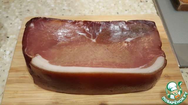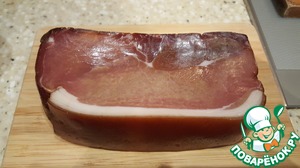 Вот такой милый кусочек сырокопчёного мяса у меня был припасён. Я срезала кожу, она на таком мясе дубовая. Срезала сало и нарезала его мелким кубиком.