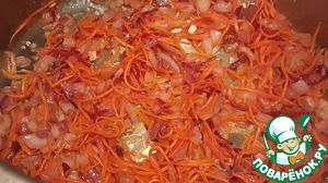 В кастрюле с толстым дном нагреть ложку масла, слегка обжарить кубики сала, добавить лук, обжарить, помешивая пару минут и добавить морковь. Обжаривать всё на среднем огне. Можно воспользоваться для обжарки сковородой, но я не люблю лишнюю грязную посуду...