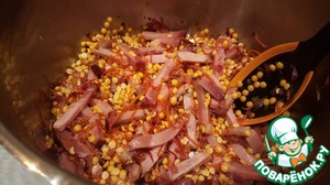 Добавить мясо, обжарить буквально минутку, при необходимости добавить чеснок. Выложить в кастрюлю промытый горох и залить водой.
