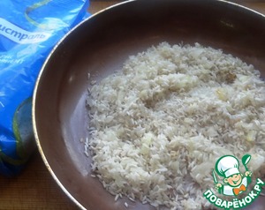 Лук мелко нарезать и обжарить до прозрачности на растительное масле. Всыпать рис и обжаривать, помешивая, 2-3 минуты.