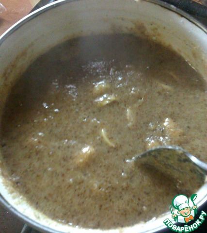 Перекладываем манку в молоко, добавляем изюм, орехи и варим до загустения