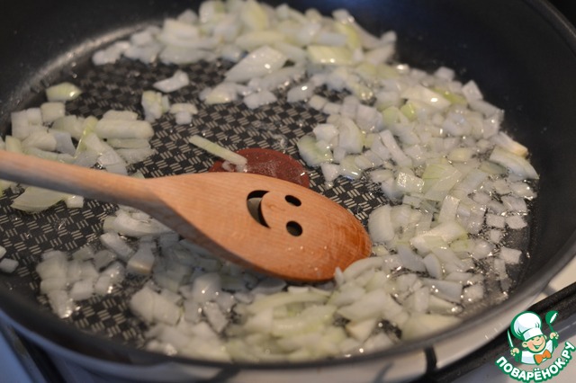 Лук нарезать на мелкие кусочки, поджарить на подсолнечном масле.