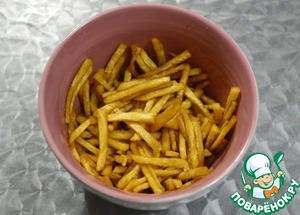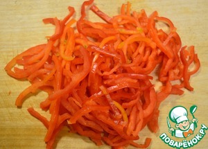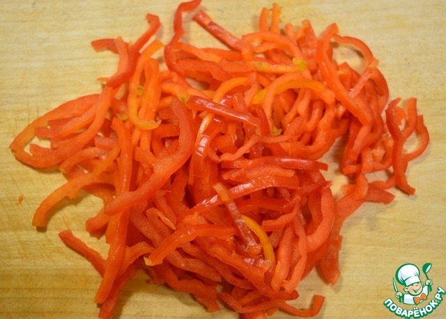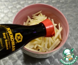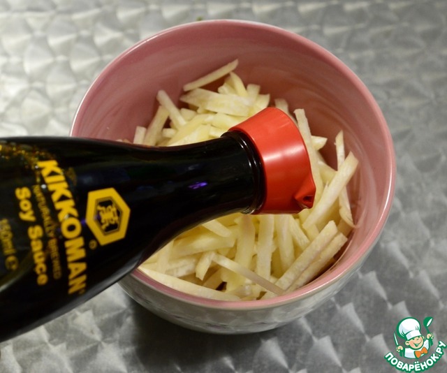 Соломкой режем редьку, заливаем соевым соусом, перемешиваем, оставляем мариноваться на 20 мин.