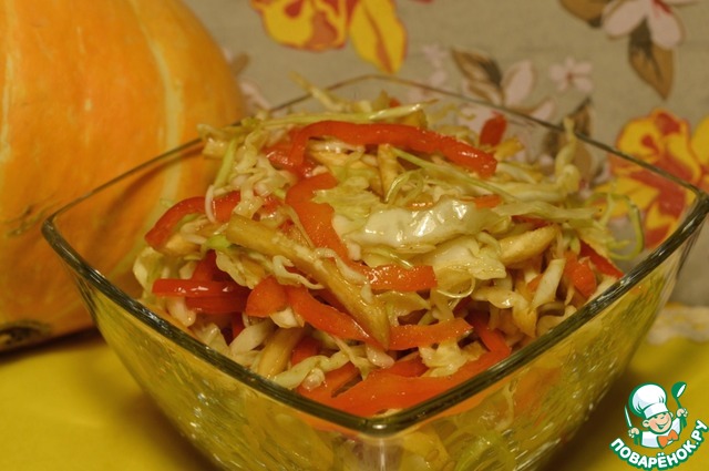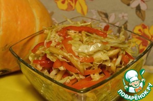 Добавляем красный молотый перец и растительное масло. Все ингредиенты смешиваем. Салат готов.