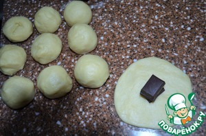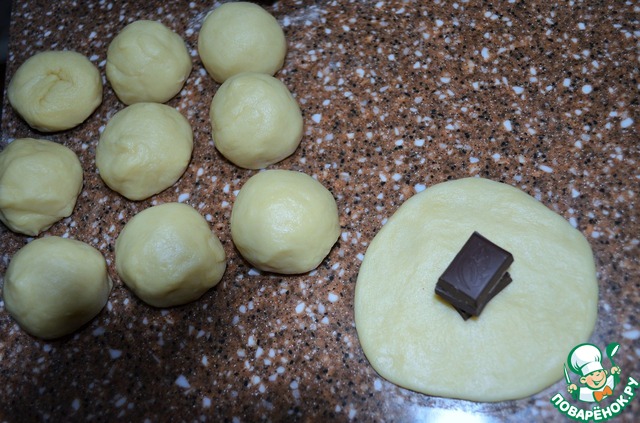 Тесто разделить на колобки по 50 г., раскатать каждый и начинив шоколадом, сформовать булочки.