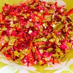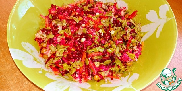 Салат выложить в салатник или на тарелку, присыпать тыквенными семечками.