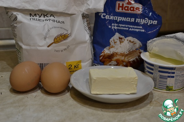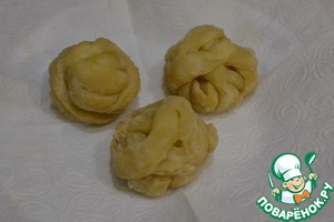 Из продуктов, кроме сахарной пудры и растительного масла замесить некрутое, упругое тесто, которое отстает от рук.