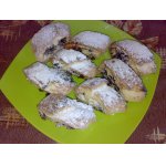 Готовые рулетики посыпаем сахарной пудрой от Haas. Я отдаю предпочтение нетающей сахарной пудре. Она реально не тает и не исчезает даже с горячих изделий.