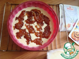 Половину теста выложила в форму и распределила повидло по всей окружности. -