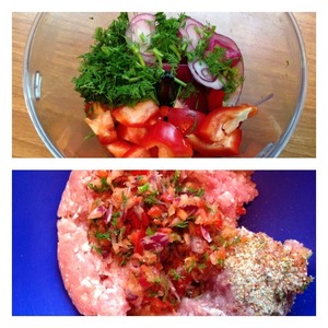 В чашу блендера выложить произвольно нарезанные: укроп, болгарский перец и лук. Измельчить и добавить к фаршу вместе с солью и специями. Вымесить фарш.