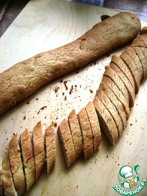 Вынуть и осторожно, острым ножом, нарезать батоны на ломтики толщиной около сантиметра.