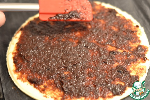 Аккуратно перекладываем круг теста на подготовленный противень и намазываем по всей поверхности сливовый джем.