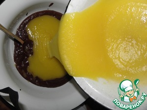 В "1" там где какао, выливаем "2" то что с желтками и очень хорошо вымешиваем.