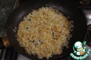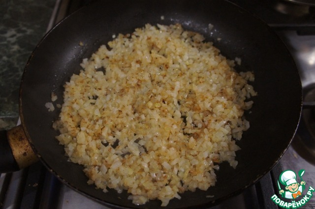 • Лук мелко нарезать и обжарить в растительном масле до румяной корочки. Остудить.
