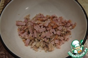 • Оба вида мяса нарезать кубиками и сложить в миску.