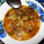 Очень сытный, ароматный суп с интересной изюминкой в виде печенки вместо мяса. Яблоки тоже вносят непривычную нотку в общий ансамбль. Неожиданно и очень интересно.