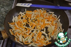 Морковь и корень сельдерея спассеровать до полуготовности.